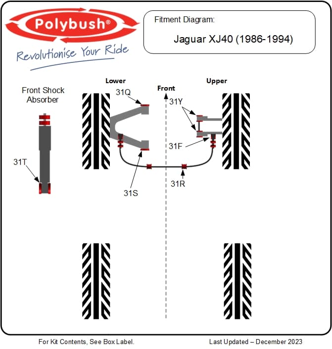 Enhance the performance and comfort of your Jaguar XJ40 with precision-engineered polyurethane suspension bushes from Polybush. Whether you’re replacing tired rubber components or restoring classic handling, our bushes offer a long-lasting, direct-fit solution for both front and rear suspension systems.