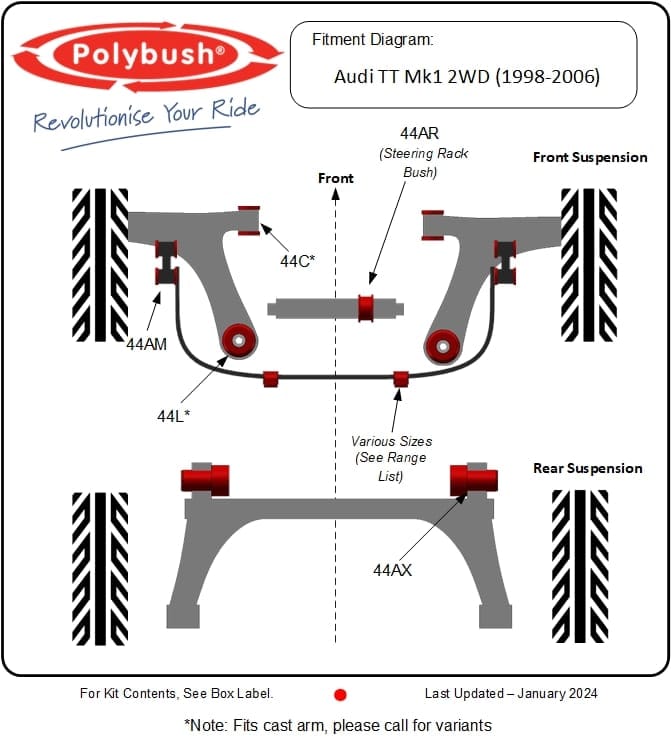 Performance grade bushes are the stiffest of the three, designed for enthusiasts who demand the utmost in handling and control. They offer minimal deflection, enhancing vehicle response and stability during aggressive driving. These bushes are perfect for high-performance or track vehicles where precision and handling are critical. While they might sacrifice some ride comfort, they deliver superior driving dynamics and control, ideal for those who push their vehicle to its limits – Including Towing!
