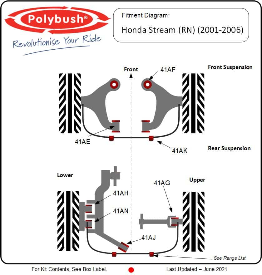 Give your Honda Stream RN (2001‑2006) a noticeable improvement in ride comfort, handling and durability by replacing standard rubber suspension bushes with premium polyurethane options. These bushes deliver superior resistance to oil, wear and weather, lasting significantly longer than their rubber counterparts.