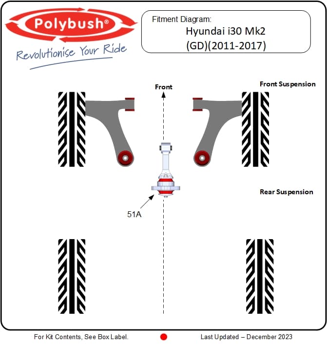 On the Hyundai i30 Mk2 GD (2011–2017), worn bushings lead to sloppy steering and uneven ride. Polyurethane bushes match OE specs for front control arms, ARBs and rear arms to restore firmness, reduce vibration and extend servicing intervals. Choose Comfort, Dynamic or Performance compound grades to suit daily driving or more demanding roads. Improve grip, handling feel and value by investing in durable UK-manufactured components.