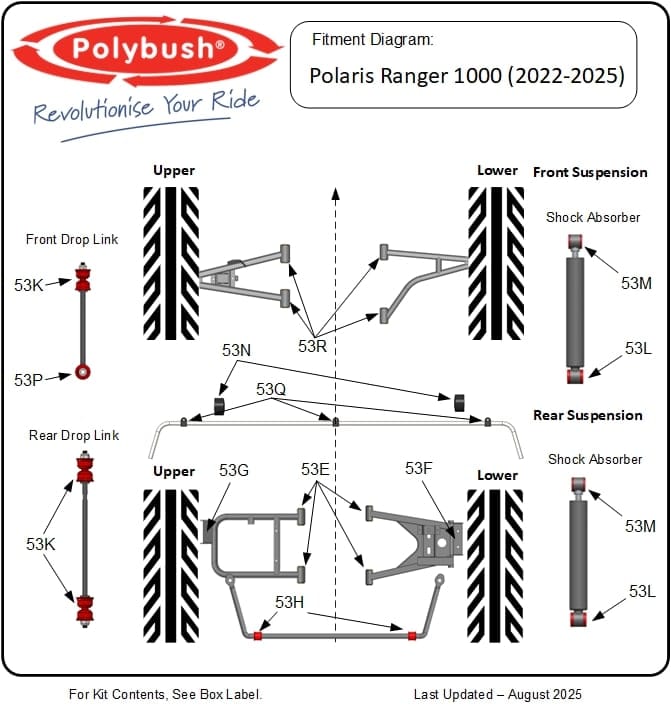 Owners of the Polaris Ranger 1000 (2022–2025) will be all too familiar with suspension bush wear. Polybush has engineered a direct-fit polyurethane solution that solves this common failure, keeping your vehicle working smoothly for years to come.