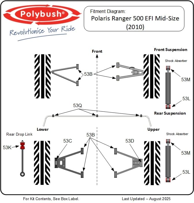 The Polaris Ranger 500 EFI Mid-Size (2010) is a practical UTV, but OEM rubber bushes remain a weak point. The common wishbone bushes (5439874, 5436832, 5436505) are known to wear rapidly, leading to poor handling and instability.