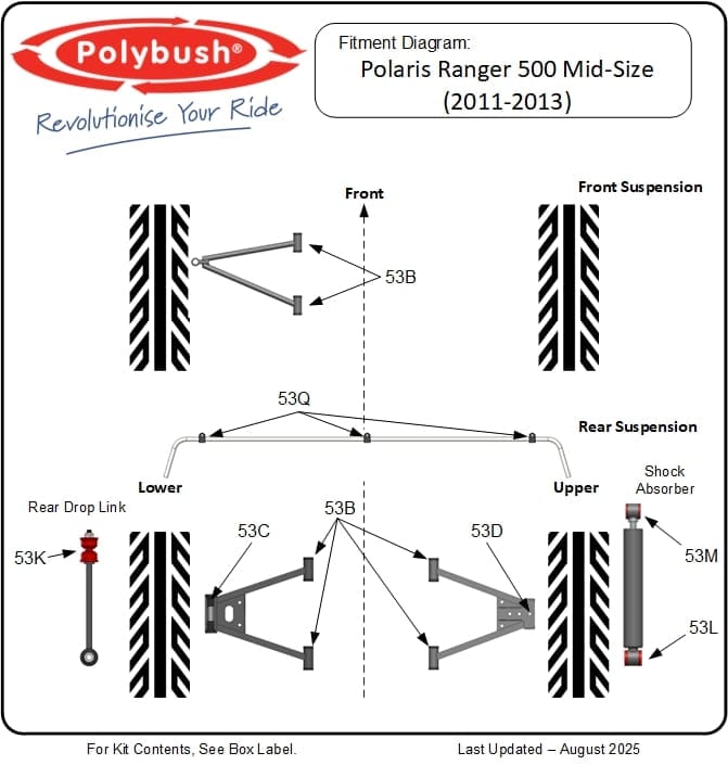 The Polaris Ranger 500 Mid-Size (2011–2013) shares the same suspension weaknesses as later models, with rubber bushes wearing out far too soon. Common complaints include failed A-arm bushings (5439270, 5438895) and anti-roll bar bushes (5456858).