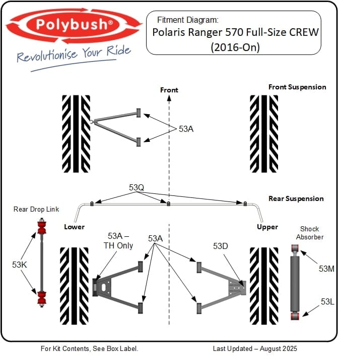 The Polaris Ranger 570 Full-Size CREW (2016–On) carries people and payload, but the strain causes OEM bushings to fail quickly. The A-arm bushes (5439874, 5436832, 5436505) and drop link bushes (1543789, 1543602) are especially prone to wear.