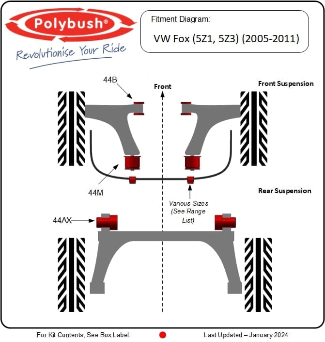 Suitable for both VW Fox 5Z1 and 5Z3, these bushes help restore confidence and comfort behind the wheel. For a lasting suspension solution that performs better for longer, choose Polybush.