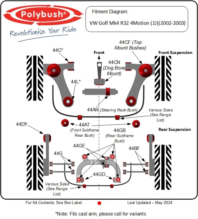 Upgrade the suspension on your VW Golf Mk4 R32 4Motion from 2002 to 2003 with precision-fit polyurethane bushes from Polybush. These OE-style replacements are designed to restore control, improve comfort and handle the added performance of the R32 chassis.
