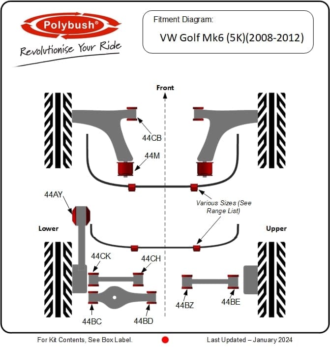 Enhance your VW Golf Mk6’s suspension with high-performance polyurethane bushes from Polybush. Suitable for all 2008–2012 Golf Mk6 variants, including GTI, our bushes provide improved control, sharper handling, and lasting durability.