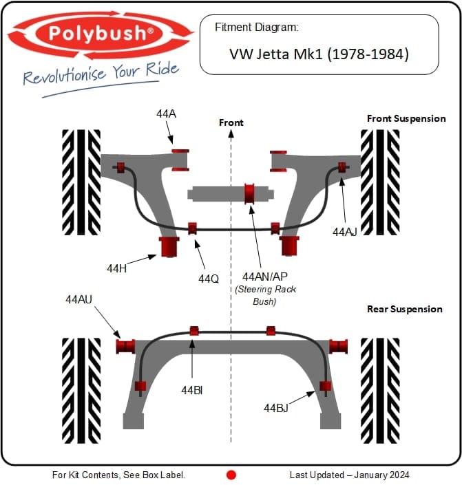 Polybush offers a full range of polyurethane suspension bushes for the VW Jetta Mk1, covering models from 1978 to 1984. These durable replacements outperform standard rubber, delivering improved handling, comfort, and lifespan.