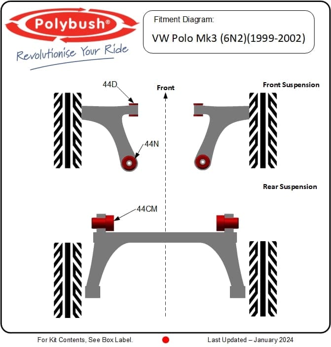 Our 6N2 bush kits restore handling precision, reduce vibration, and offer maintenance-free durability for years to come. Whether you’re replacing worn components or upgrading for better road feel, Polybush offers the perfect fit for your Polo Mk3 6N2 suspension system.