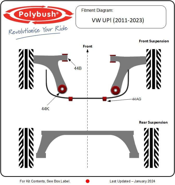 Whether you’re replacing worn bushes or upgrading for performance, our UK-manufactured Polybush kits ensure lasting durability and easy installation, restoring your VW Up’s original driving feel or improve upon it with confidence.